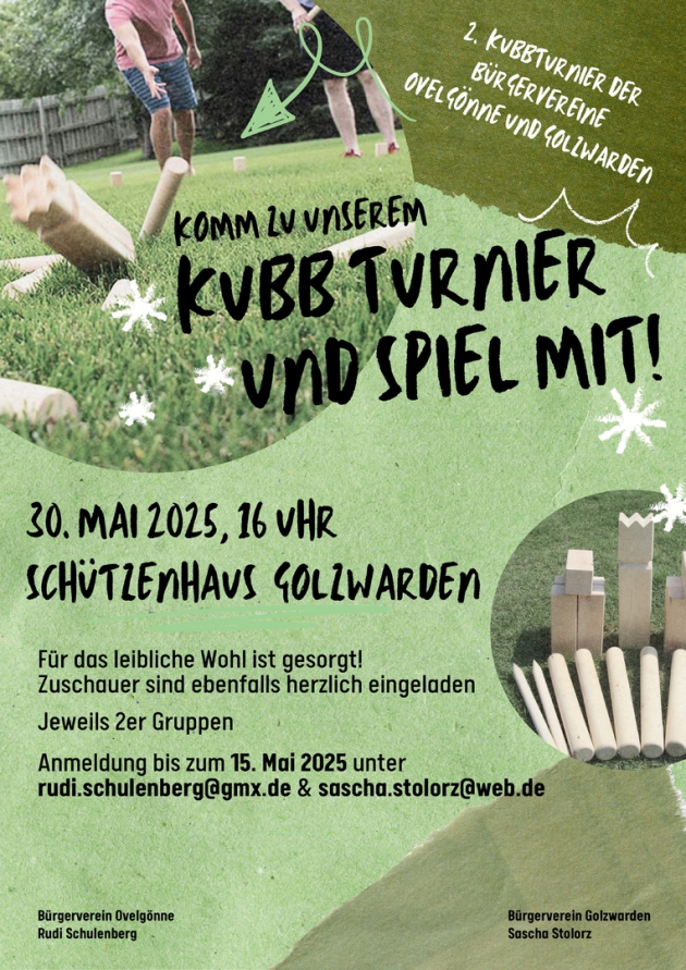 Nach dem erfolgreichen Auftakt im letzten Jahr laden der Bürgerverein Ovelgönne und der Bürgerverein Golzwarden auch 2025 wieder zum gemeinsamen KUBB-Turnier ein. Dieses Jahr ist der BV Golzwarden Gastgeber der Veranstaltung.